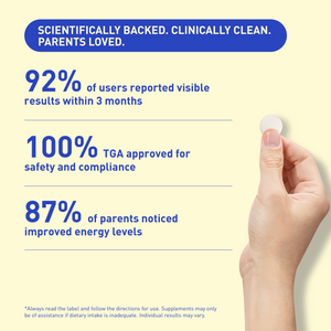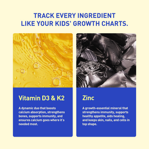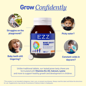 These aren’t your average chalky calcium tablets. EZZ Bone Growth Chews bring together Lysine, Calcium, Vitamin K2, and D3 to help build your child’s strong bones and healthy teeth. But we don’t stop there. We’ve packed in plant-based nutrients to support their gut health and immunity, so the good stuff actually gets absorbed. Add a hit of micronutrients for energy, cell repair, nerve support, and smoother digestion, and you’ve got one tasty little chew that does more for your kid with every bite.