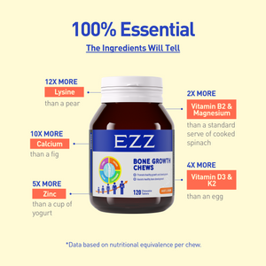 EZZ Bone Growth Chews bring together 13 essential nutrients including Calcium, Vitamin D3 and K2, amino acids, prebiotics and herbal extracts, all in a tasty, TGA-approved chew.
