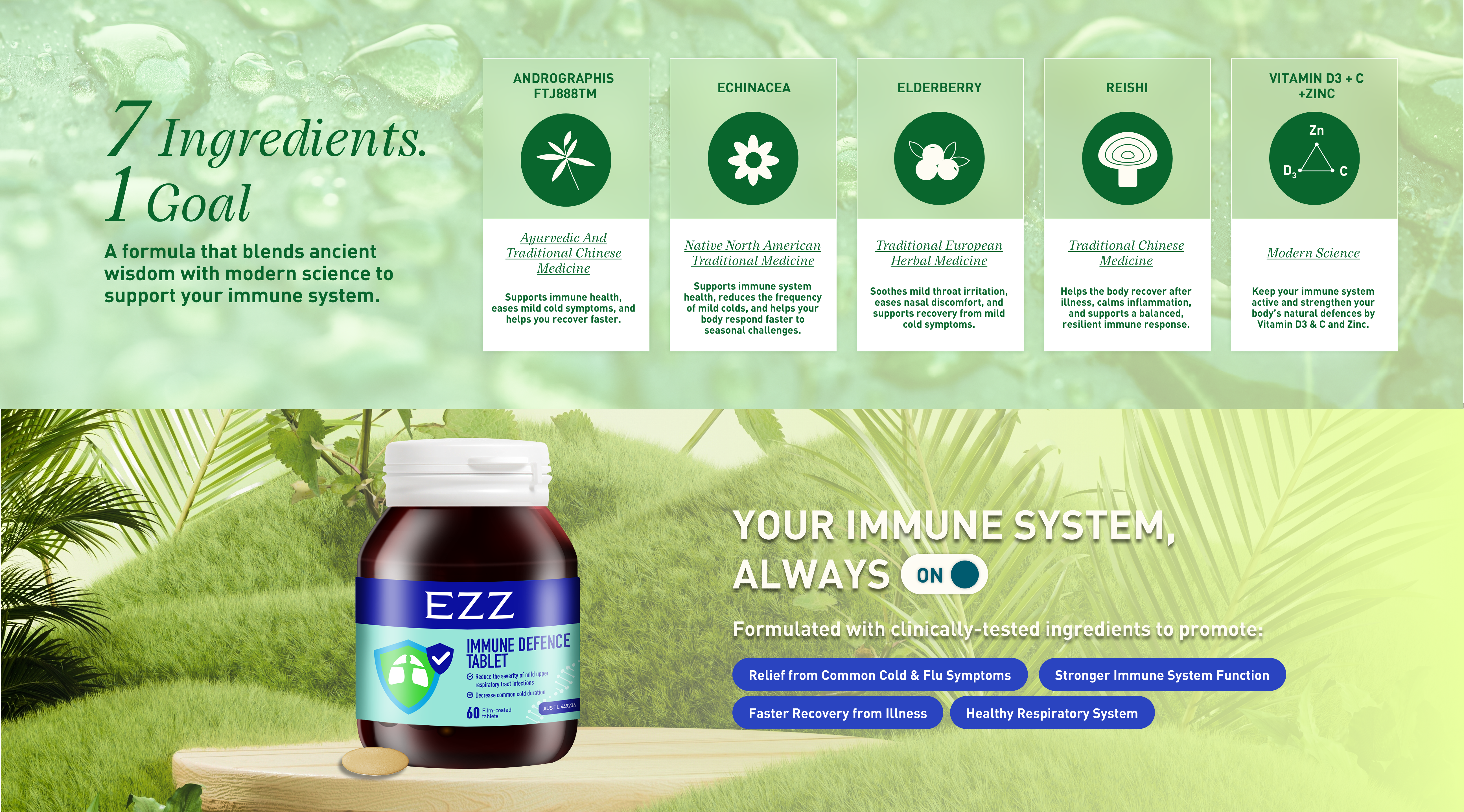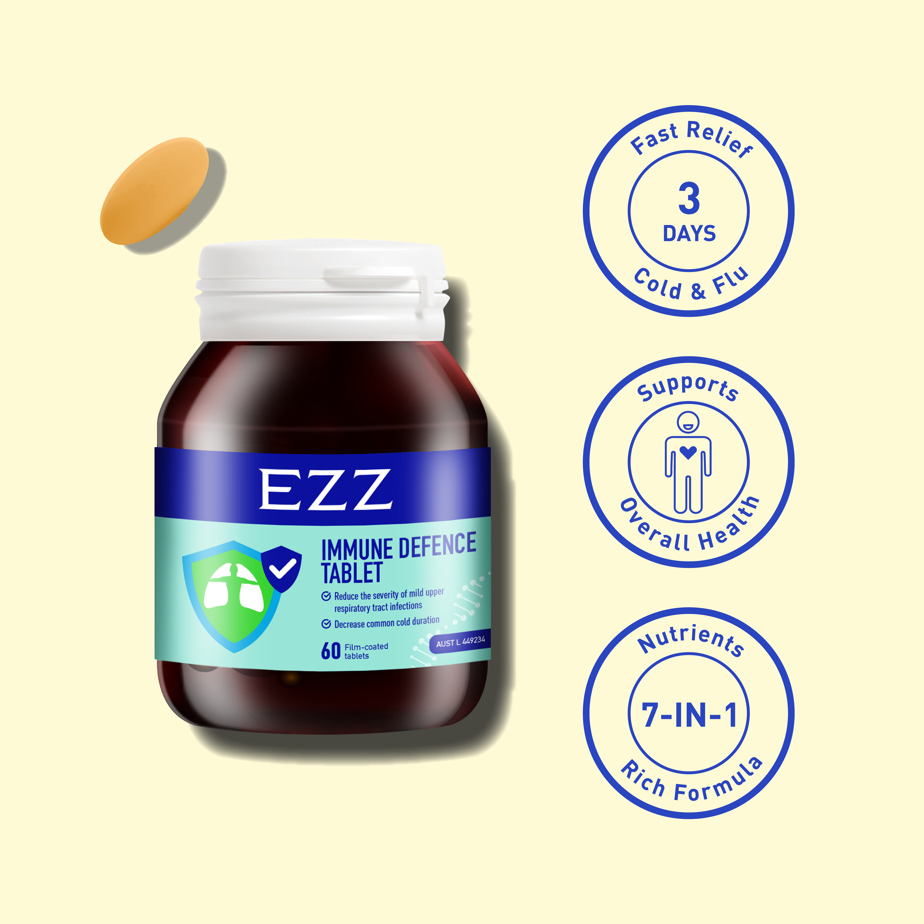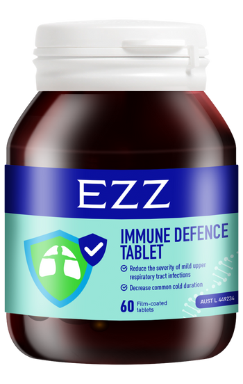 EZZ Immune Defence Tablet is made with traditional herbs long used in Western and Asian herbal medicine to help strengthen the body’s natural defences. Andrographis FTJ888™ and Echinacea support immune system health and help relieve symptoms of colds and mild upper respiratory infections, while Elderflower and Reishi mushroom promote recovery and overall resilience.