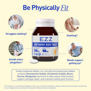 EZZ Joint Energy Boost Tablets are formulated to help your joints rebuild, recover, and keep moving. They combine six clinically tested ingredients — including glucosamine, chondroitin, and boron to target cartilage repair, reduce inflammation, and support joint resilience over time.