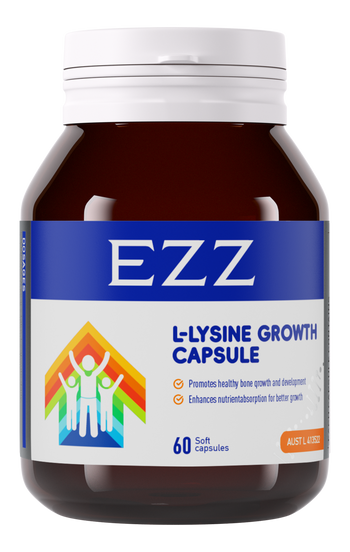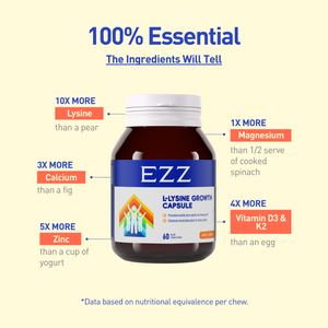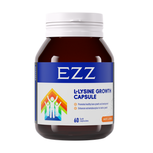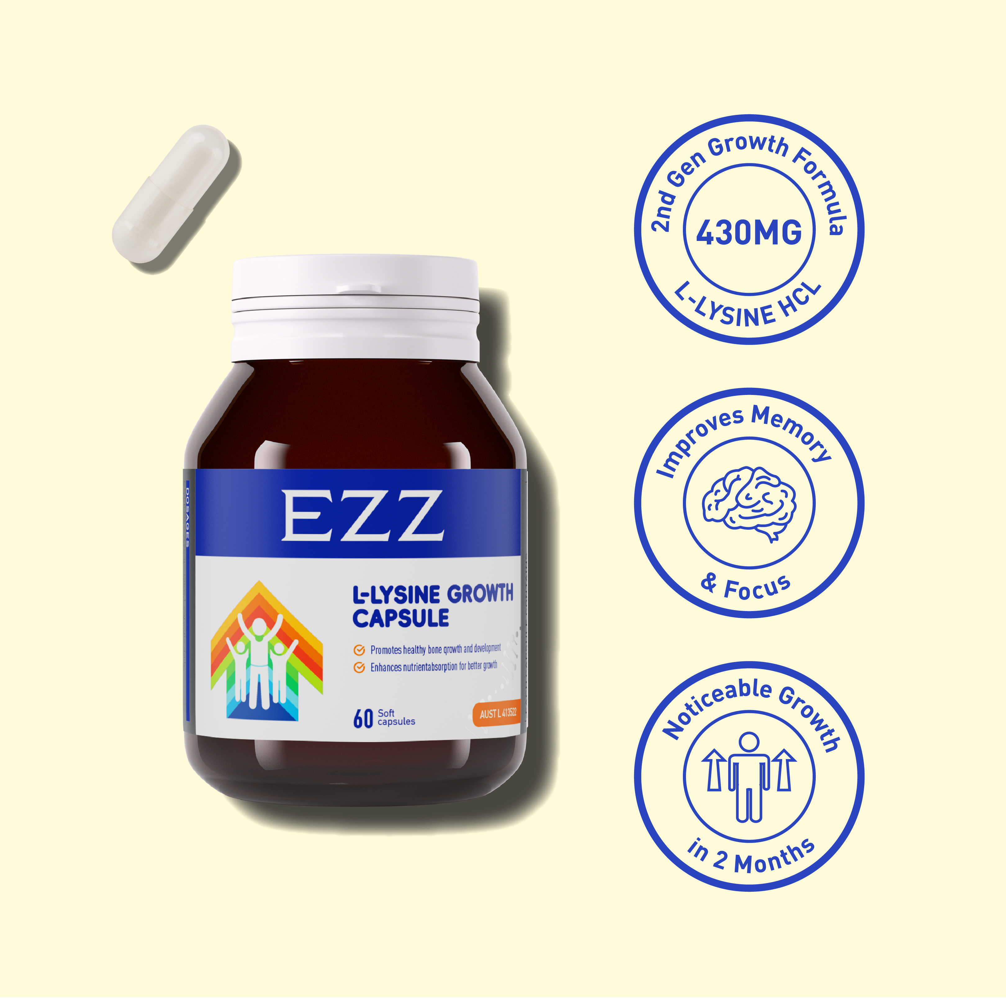 EZZ L-Lysine Growth Capsule packs a higher hit of lysine (350 mg) to help build strong bones, support muscle growth, and keep up with those big growth spurts. Calcium, Vitamin D3, and Vitamin K2 team up for bone density, Magnesium keeps muscles firing, and Collagen, Glutamine, and Glycine back up healthy tissue repair. Throw in Zinc and Lactoferrin for immune back-up, and you’ve got a one-a-day formula that’s ready for action.