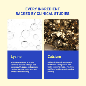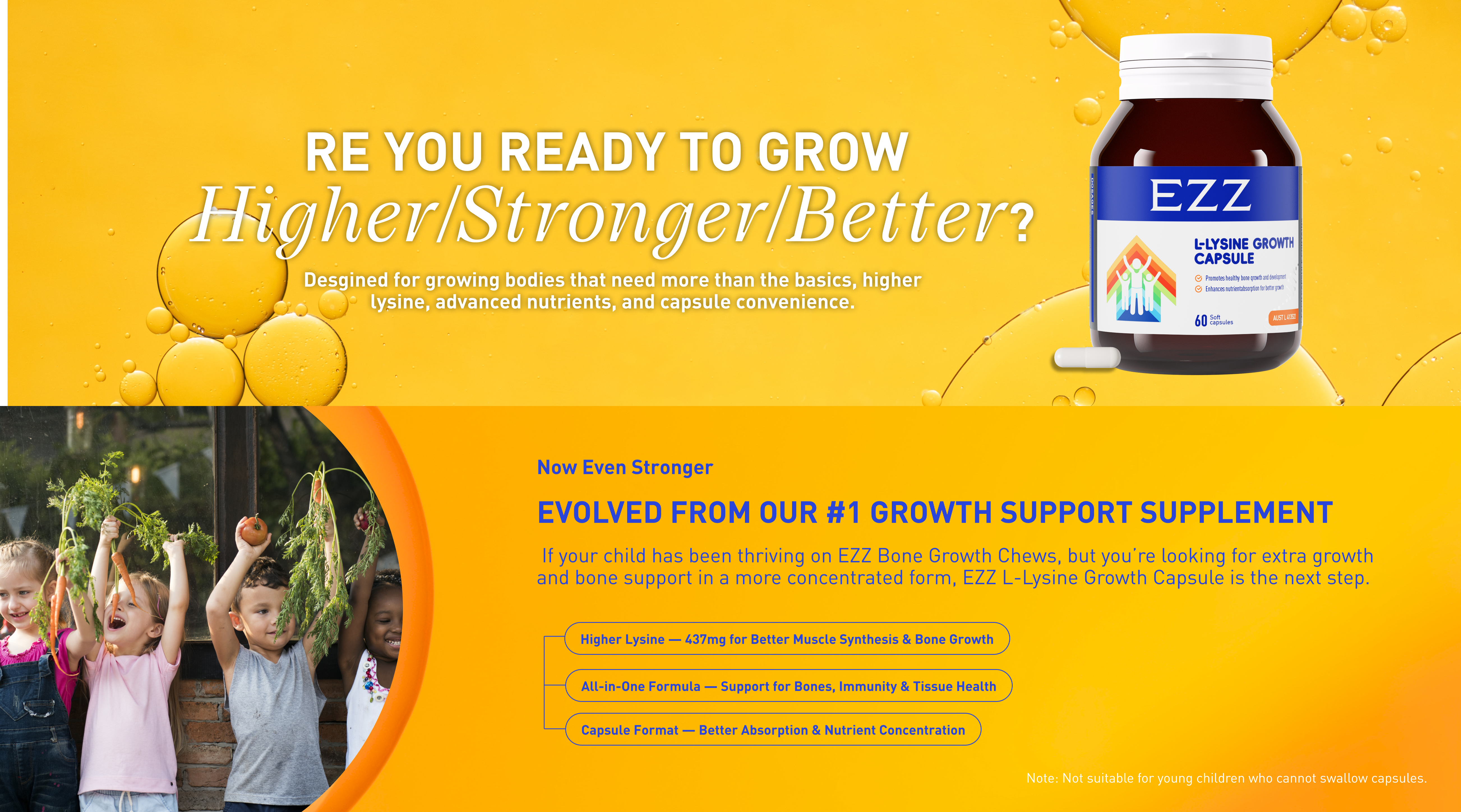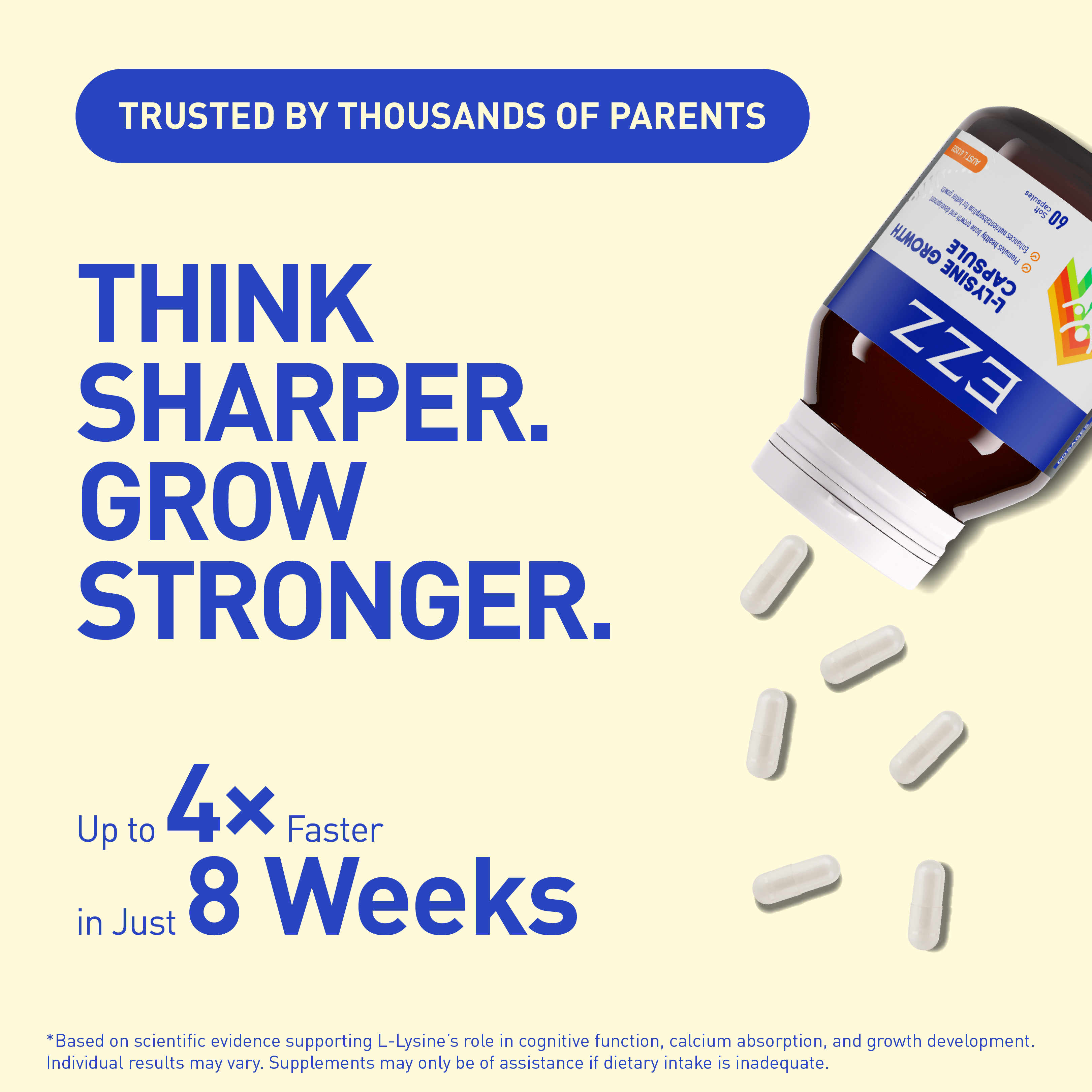 This isn’t just a growth supplement — it’s the step up from Bone Growth Chews. EZZ L-Lysine Growth Capsule packs more lysine for stronger bones, healthy muscle growth, and big spurts. Calcium, Vitamin D3, and K2 strengthen bones, while Magnesium and Collagen support muscles and recovery. Lactoferrin and Zinc help immunity and gut health, so every nutrient works harder — all in one easy capsule for older kids and teens.