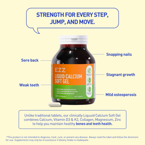EZZ Liquid Calcium Soft Gel delivers bone-strengthening hydroxyapatite — the same mineral your bones are made of — for better absorption and support where it counts. Vitamin D3 and K2 guide calcium into the right places, Magnesium keeps muscles steady, and Zinc helps with repair. Collagen steps in to back up bone and joint structure, making every capsule a complete daily boost.