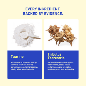 Epimedium Sagittatum Whole Plant Extract (Horny Goat Weed), Selenomethionine (Selenium), Serenoa Repens Fruit Extract (Saw Palmetto), Taurine, Tribulus Terrestris Fruit Extract (Tribulus), Withania Somnifera Whole Plant Extract (Ashwagandha), Zinc Oxide (Zinc)