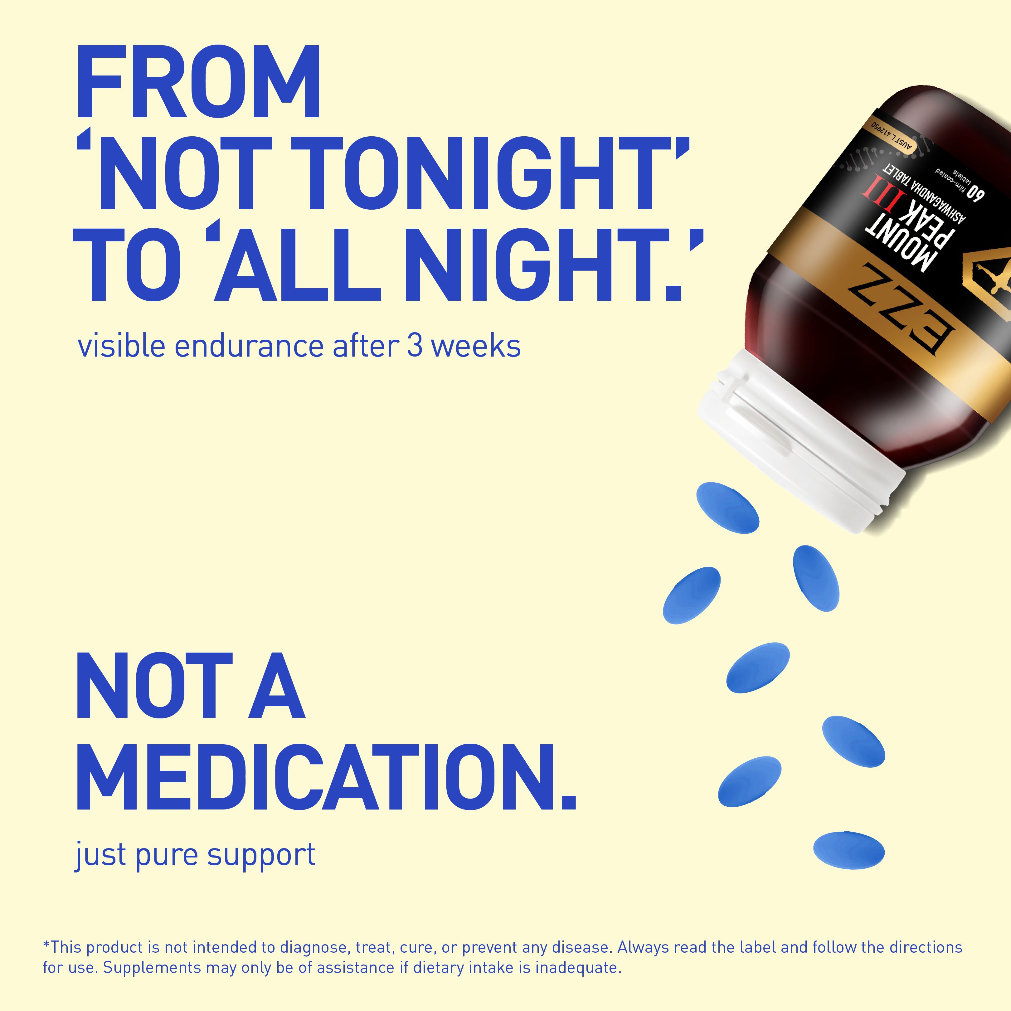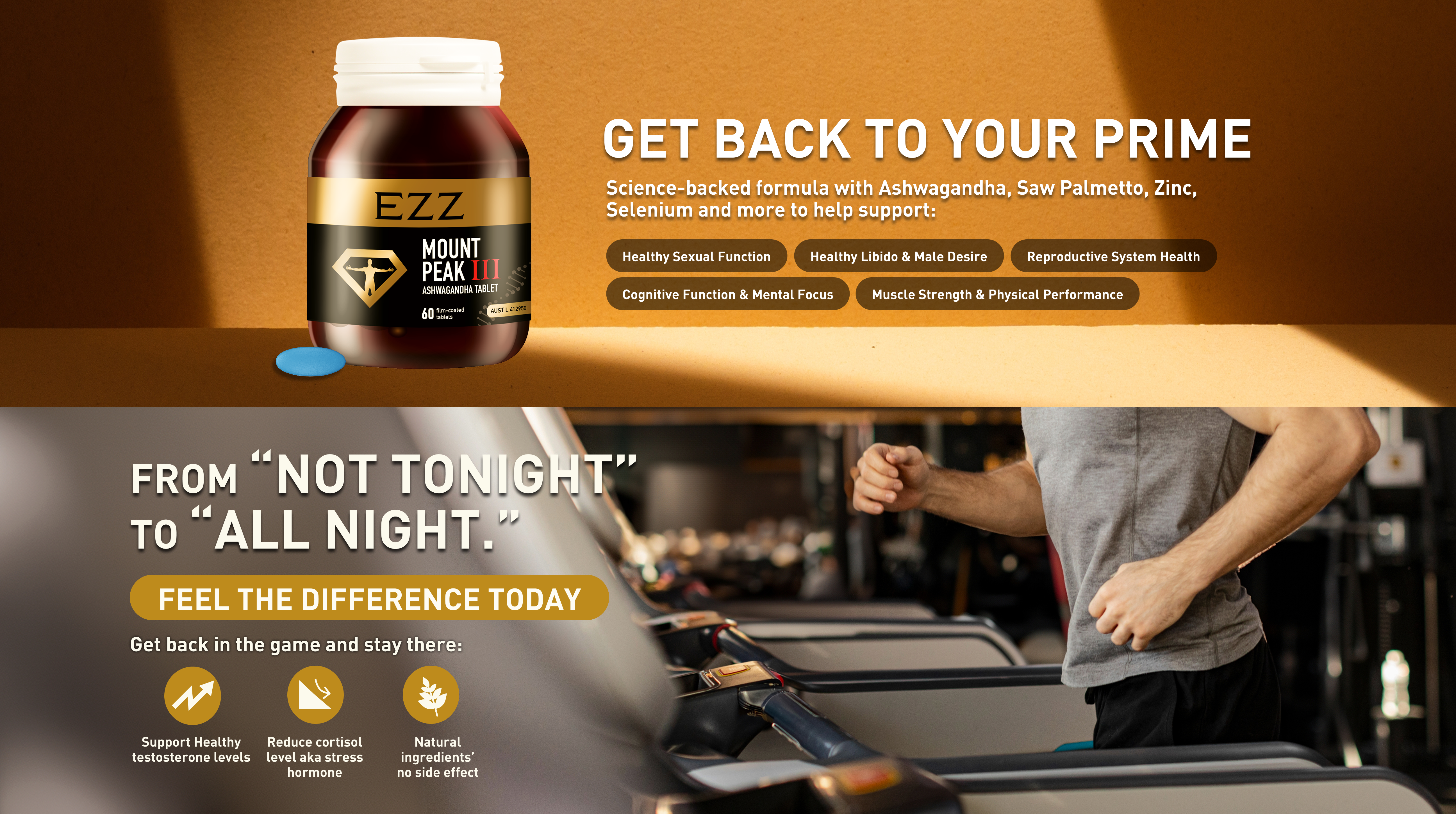 Forget about the blue pills, this is the real deal. EZZ Mount Peak III is formulated to help you feel, perform and look like your best YOU again. It contains seven herbs and minerals including Ashwagandha, Tribulus, Epimedium and Saw Palmetto to boost healthy testosterone levels, support blood flow and enhance sexual function and stamina.